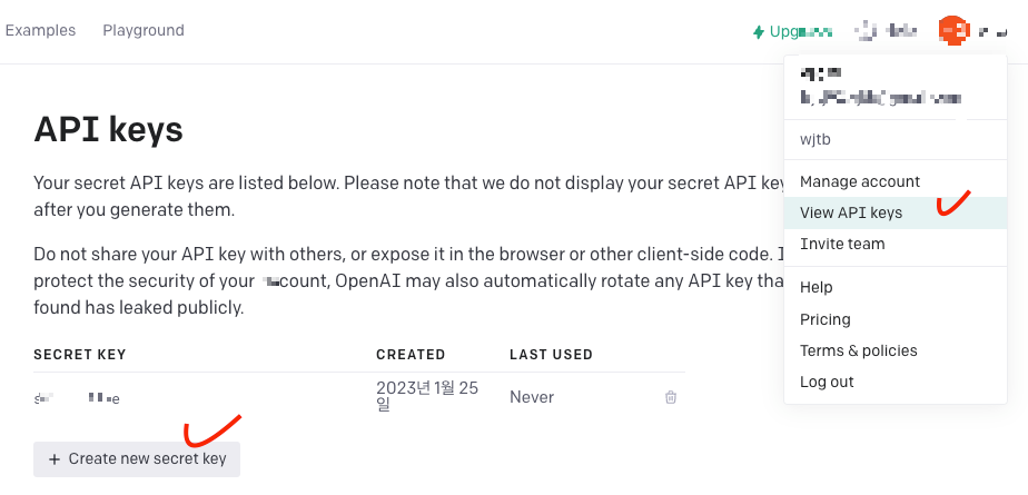 - openai key : openai에서 받은 API key를 등록합니다. 이 Key는 노출되지 않도록 조심하셔야 합니다.
