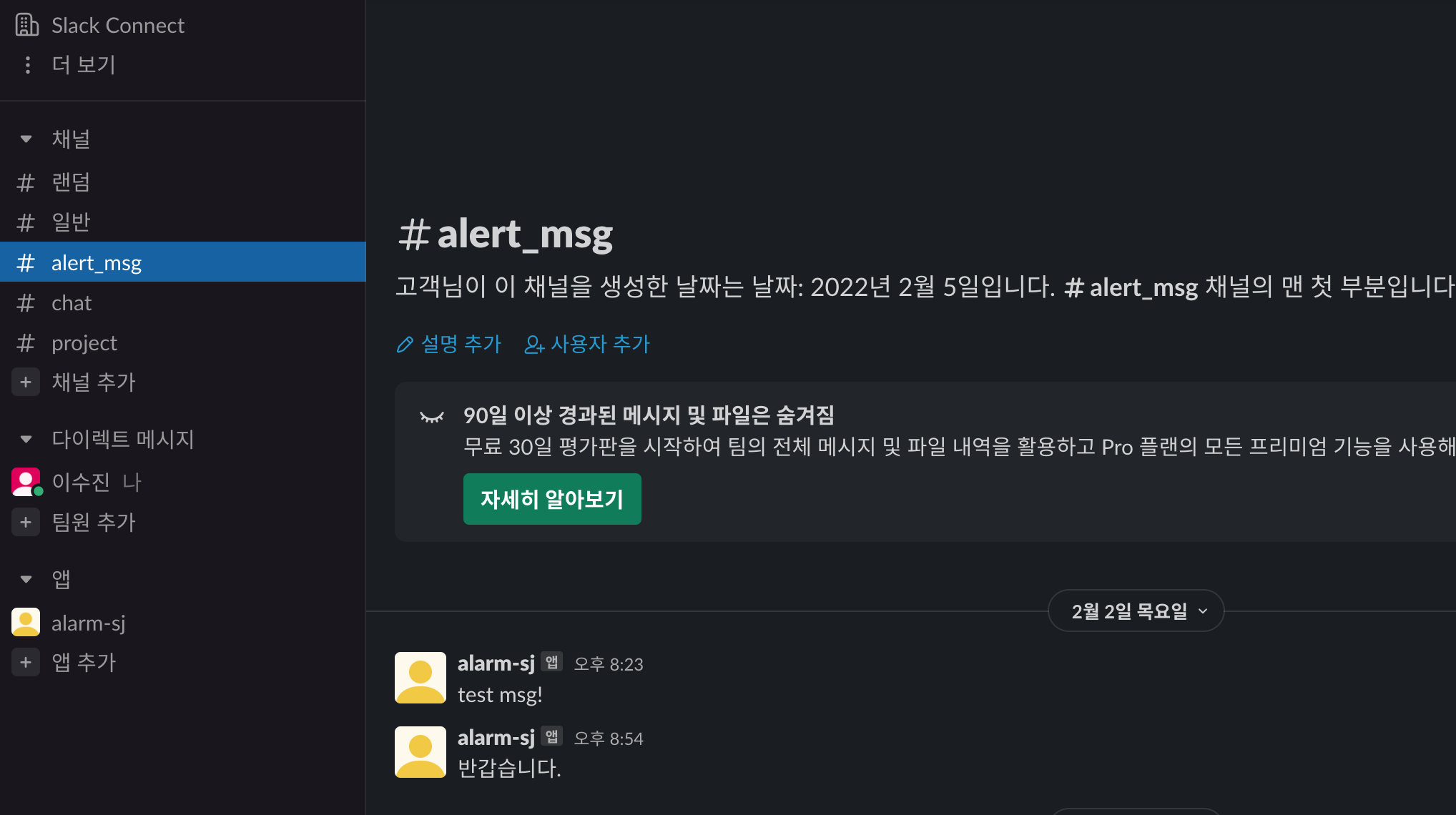 - openai gpt의 응답값을 제 slack의 alert_msg 라는 채널에 보내줍니다.