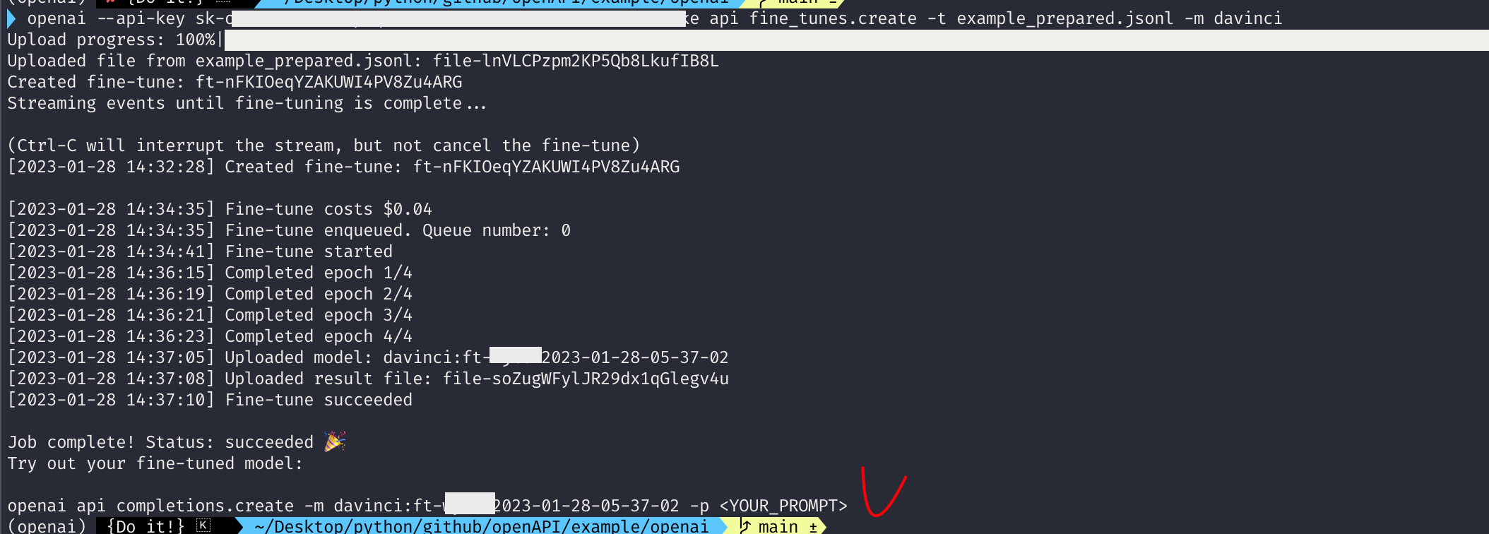 openai --api-key YOUR_KEY api fine_tunes.create -t example_prepared.jsonl -m davinci