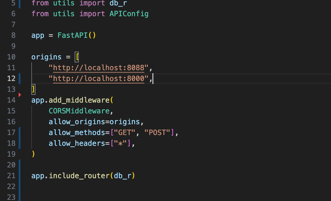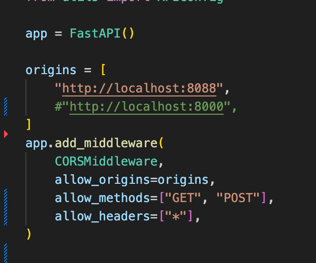 CORSMiddleware를 import한 후 app의 add_middleware에 추가한 뒤 origins을 설정해주면 됩니다.