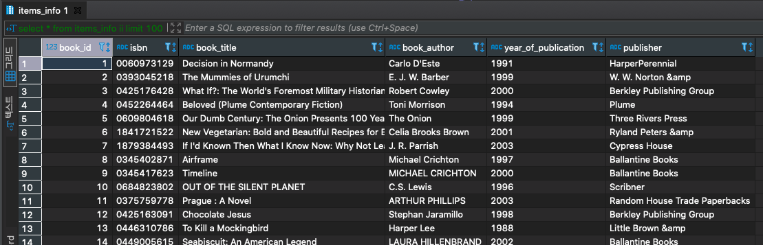 해당 데이터는 도서에 대한 id가 있고 그것에 대한 제목, 저자 정보 등이 있는 데이터입니다.