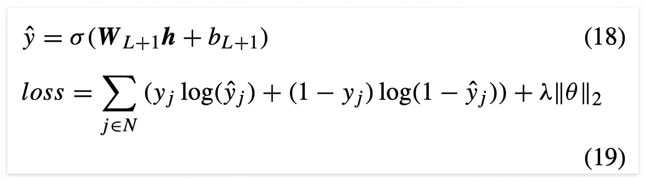 - 포괄적으로 정보를 담은 second order feature interaction 값을 feed forward neural network 구조로 넣어줍니다 (식 14). 이때 H0는 hs로써 second order feature interaction 값입니다.