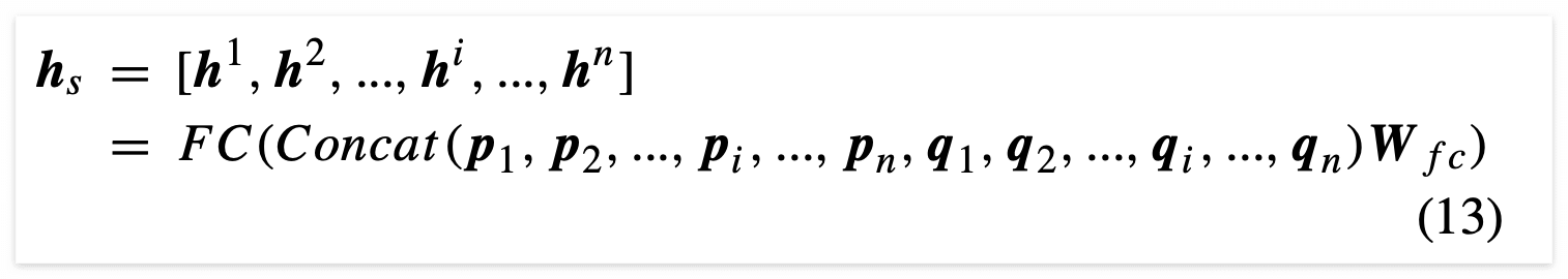 이 과정을 통해 second order feature interaction 과정을 좀 더 풍부하게 다뤄주게 됩니다. 본 인코더의 마지막으로 모든 요소를 전부 concatenation한 후 Fully-connected layer를 통해 포괄적인 second order feature interaction을 학습합니다(식 13). 이 결과로 풍부한 정보를 부여할 수 있게 되는것이죠.