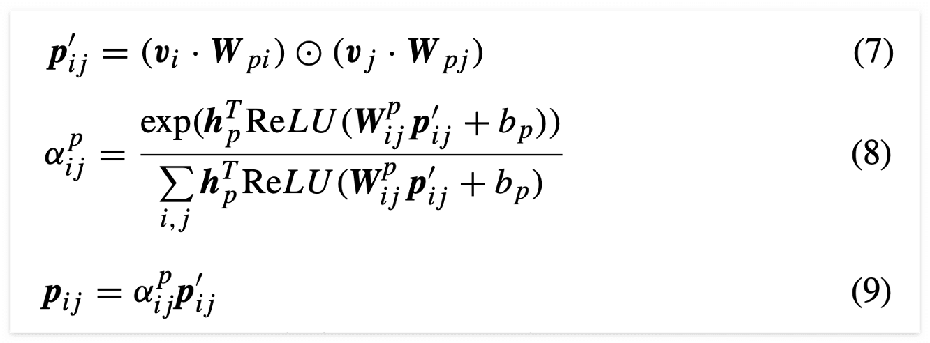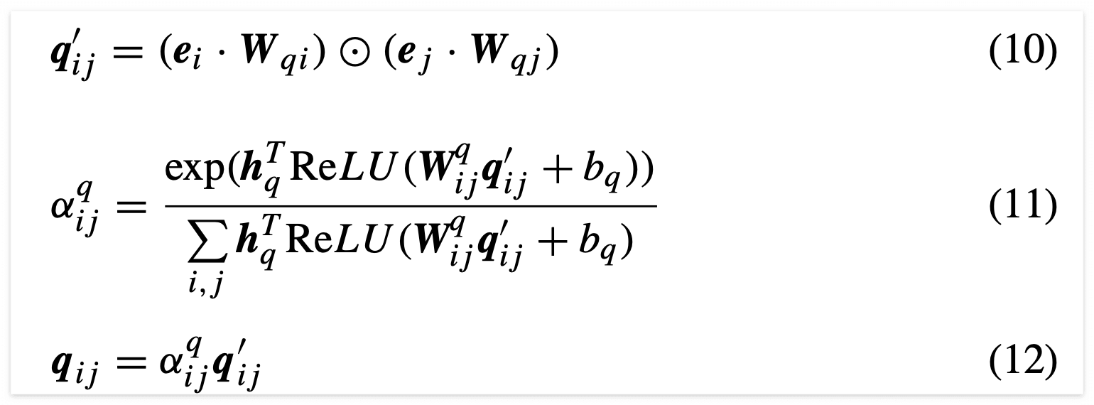 - 일반적으로 모든 feature interaction이 final task에 전부 연관되어 있지 않습니다. 연관성 없는 feautre는 오히려 noise하고 모델의 일반화 성능을 악화시킬 수 있는데요. 이를 방지하기 위해 attention score를 MLP 구조를 활용해 계산해줍니다.( 식 8, 9 )