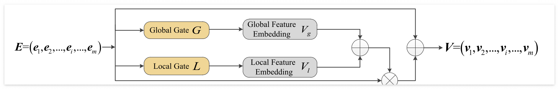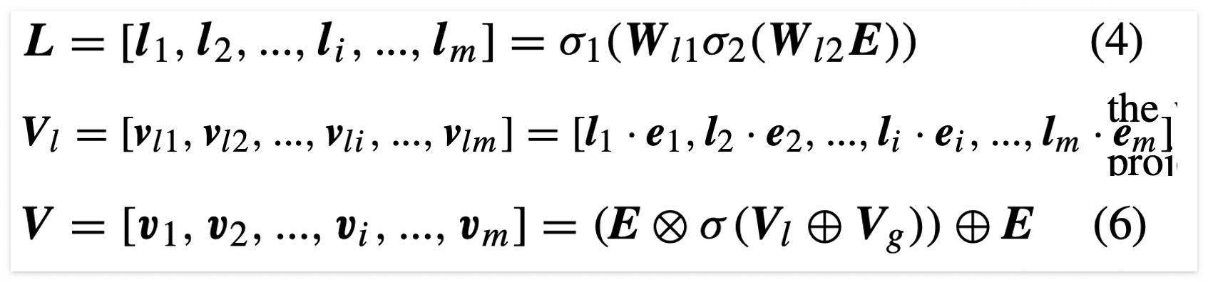 - 임베딩 벡터에 direct로 nerual network 구조를 적용합니다(수식 4). 이렇게 생성된 벡터를 L이라고 칭하며, local gate라고 칭합니다.