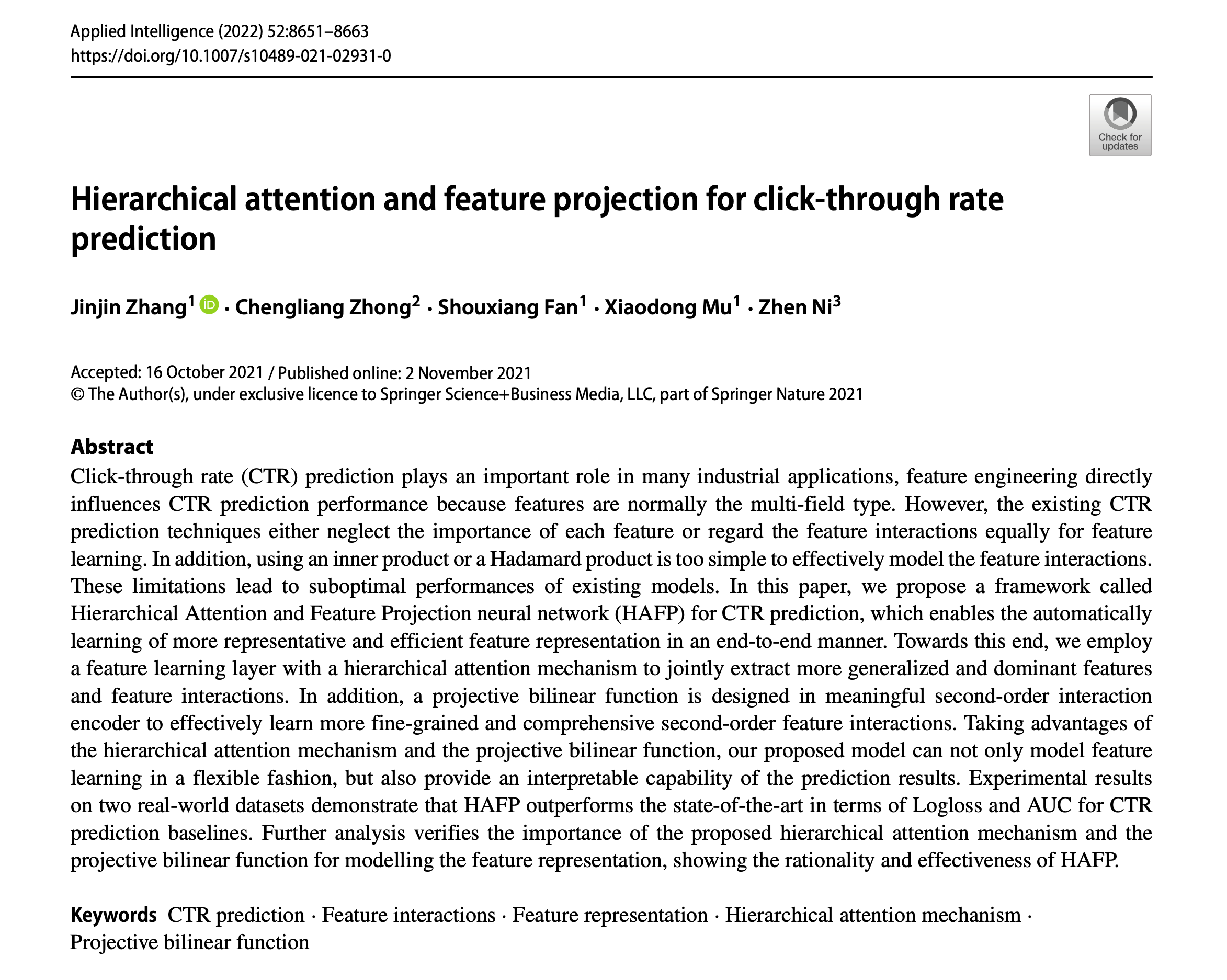 이번 포스팅은 추천 시스템 논문 리뷰 포스팅입니다. 본 논문의 제목은 Hierarchical attention and feature projection for click-through rate prediction(CTR prediction)이라는 논문입니다.
