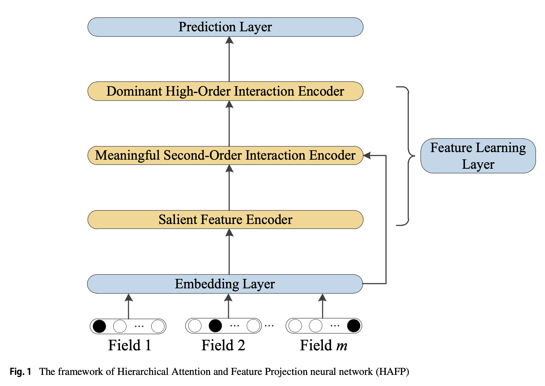 본 논문에서 주장하는 클릭률 예측 모델인 HAFP 전체 프레임워크는 위 그림과 같습니다. 눈에 띄는 부분은 노란색으로 칠해진 Feature Learning Layer인데요. 이 layer에 속한 3개의 encoder가 이 논문에서 주장하는 클릭률 예측 모델의 핵심입니다.