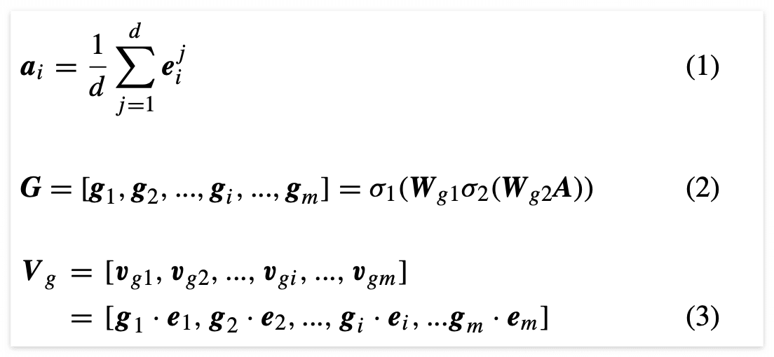 - 각 임베딩에 mean pooling을 적용해 global information를 구합니다( 수식 1 ). 이렇게 나온 global weight vector를 A로 지정합니다.