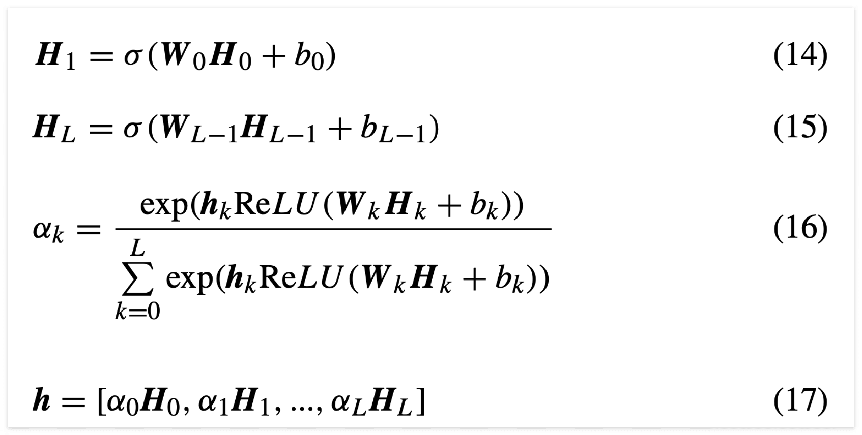- layer마다 제공하는 서로 다른 정보들이 있을 수 있습니다. 예를 들어, 0번째 layer와 비교 했을 때 최상단 layer는 좀 더 포괄적인 정보를 담고 있겠죠? 따라서, 좀 더 세부적이고 유용한 정보를 구성하기 위해 attention mechanism을 활용해서 attention score를 구하고(식 16) 이를 layer output에 곱해줍니다(식 17).