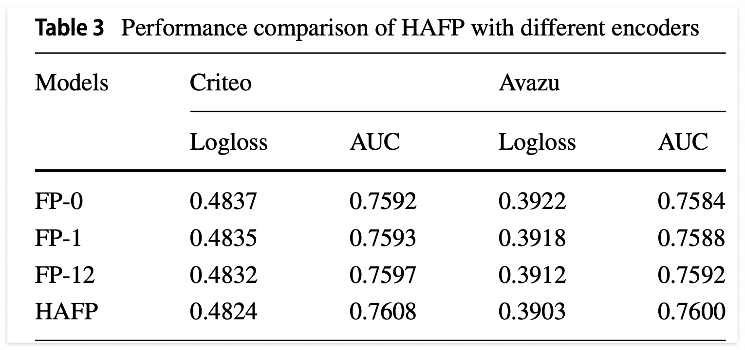 - FP-0 : HAFP에서 salient feature encoder와 meaningful second-order interaction encoder 그리고 dominant high-order interaction encoder에서 어텐션 메커니즘을 빼버린 모델입니다.