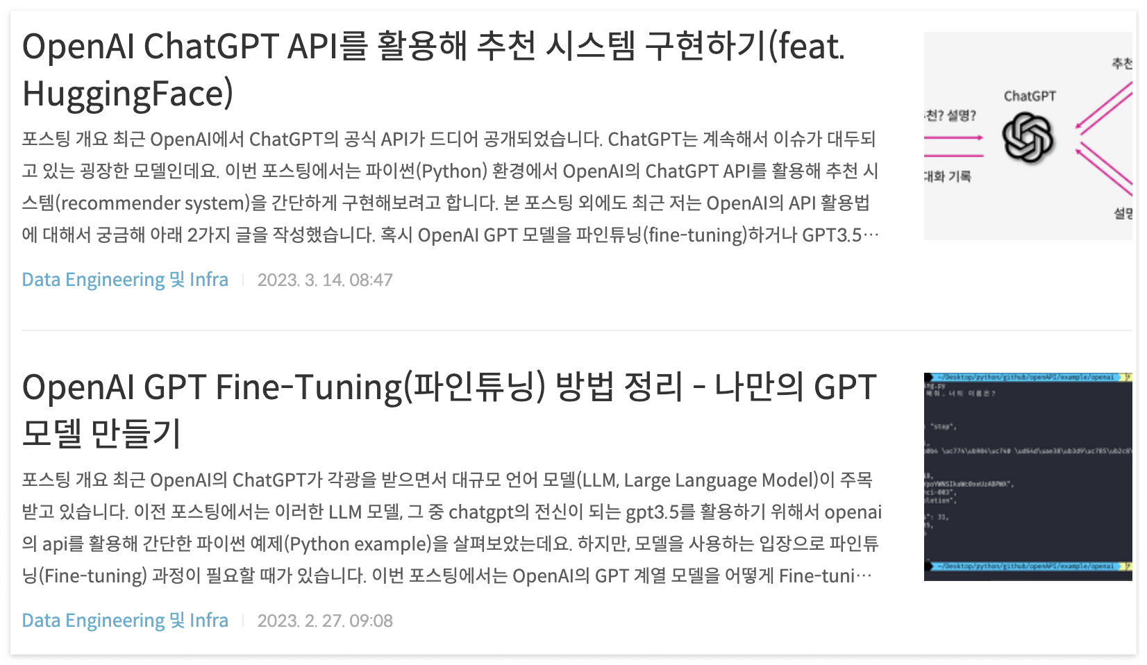 그 흐름에서 OpenAI의 GPT API가 나온 거의 극초반, 내가 작성했던 2개의 블로그 글(위 사진)이 정말 큰 인기를 누렸다. OpenAI GPT-Fine-Tunging(파인튜닝) 하는 방법과 OpenAI ChatGPT API를 활용해 추천 시스템 구현하기라는 글이었다. 특히, 추천 시스템 구축하는 글은 파이토치 한국 사용자 모임 2회 밋업에서 발표도 했었다.