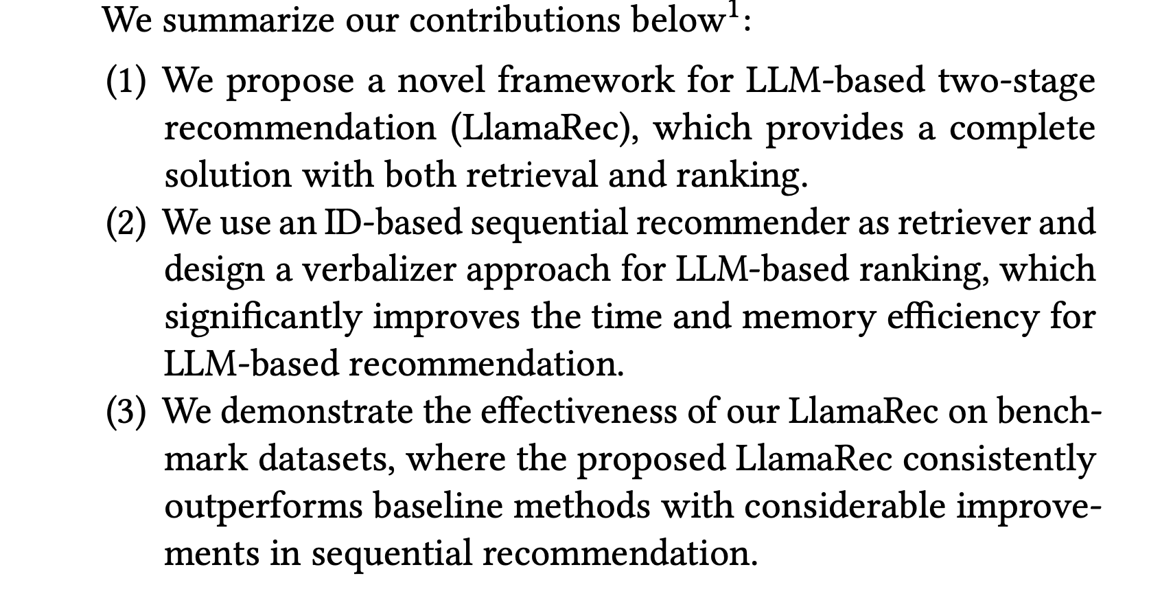 따라서, 저자들이 주장하는 Llamarec은 two-stage framework 구조를 통해 LLM 기반 추천 시스템을 효율적으로 훈련하고 추론할 수 있으며 기존 방법보다 향상된 성능을 제공할 수 있다고 합니다. 그러므로, 아래와 같이 3가지로 저자들이 주장하는 LlamaRec을 요약할 수 있습니다.