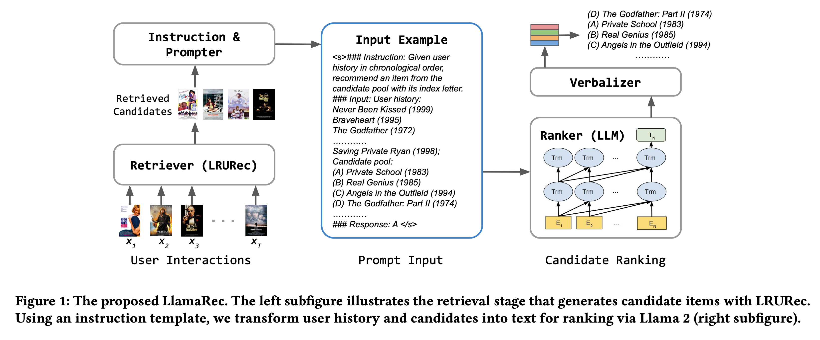 (2) ID 기반의 sequential recommender는 retriever로 사용하고 verbalizer 접근 방법으로 LLM 기반 Ranking 수행하여 추천의 시간과 메모리 효율성을 크게 향상