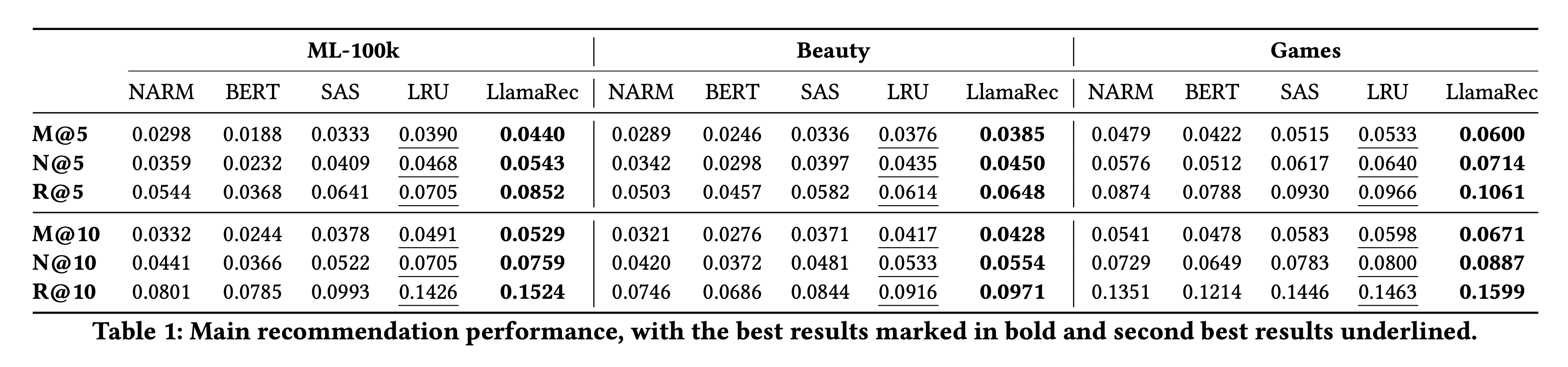 또한, 비교를 위해 선택한 baseline model은 NARM(RNN 기반 추천 시스템), SASRec(Sequential 및 unidirectional 어텐션 기반 recommendation system), BERT4Rec(BERT 기반 추천 시스템), LRURec을 사용했다고 합니다.