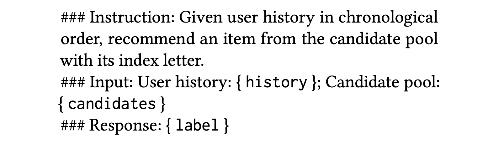Instruction에는 사용자 이력이 시간 순서로 정렬되어 있고 candidate pool에서 index letter와 함께 아이템을 추천하도록 설정해놓습니다. 그리고 input에는 사용자 히스토리 및 candidate pool을 넣어주고 response를 예측받도록 해놨습니다.