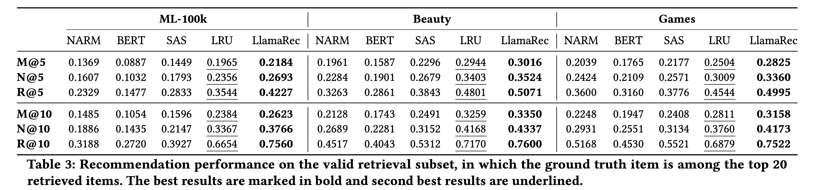 저자들은 실험 결과를 Table 1과 Table 3, Table 4에 걸쳐서 정리해두었습니다. Table 1은 저자들이 주장한 LlamaRec과 baseline 모델들의 전반적인 비교를 나타내 것입니다. bold로 칠해진 것이 가장 좋은 결과이고 밑줄이 그어진 것이 그 다음으로 성능이 잘 나온 모델입니다. Table 3은 retrieval된 상위 20개의 아이템 중 실제 아이템이 포함된 유효한 retrieval subset에 대한 추천 시스템 성능을 나타낸 것입니다. Table 4는 LLM 기반 추천 시스템 모델들과 비교 했을 때의 성능을 비교한 것입니다.