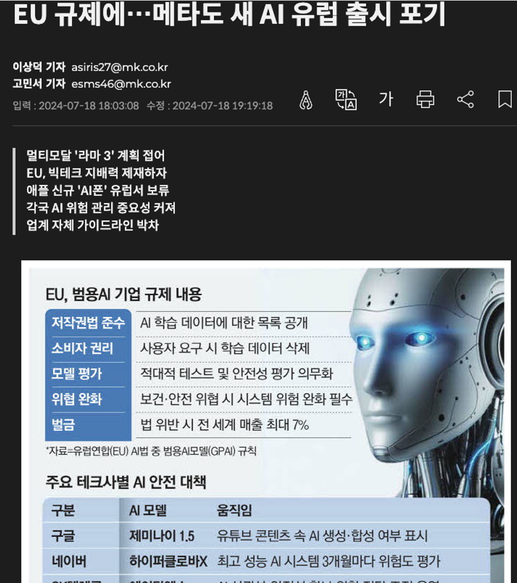 AI 윤리에 대해서 이제 각국의 규제나 표준이 만들어지고 있습니다. 우리나라 방송통신위원회에서도 생성형 AI 윤리 가이드라는 것이 나왔고 EU는 특히 정밀하게 윤리적인 것을 규정하고 있습니다. 이걸 지키지 못하면 서비스를 출시할 수도 없죠.