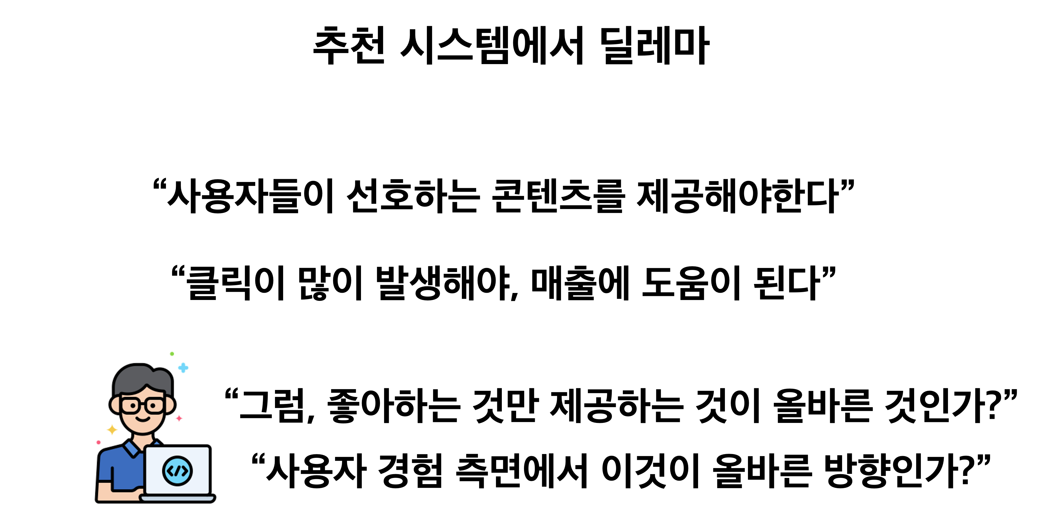 추천 시스템 입장에서는 고객이 좋아하는 것을 계속 노출시켜서 클릭이 많이 발생하도록 하는게 좋습니다. 그러나, 이게 AI 서비스를 개발하는 제 입장에서는 과연 이게 UX 관점에서 좋을까?라는 고민을 많이 했었죠. 고객이 선호하는 것만 제공하면 편향(bias)가 생길거니까요. 그래서 제가 이 자료를 발표한 AI 기획자 Day를 주최하신 리더님과 당시 이 고민에 대해 많이 이야기 나눴었습니다.