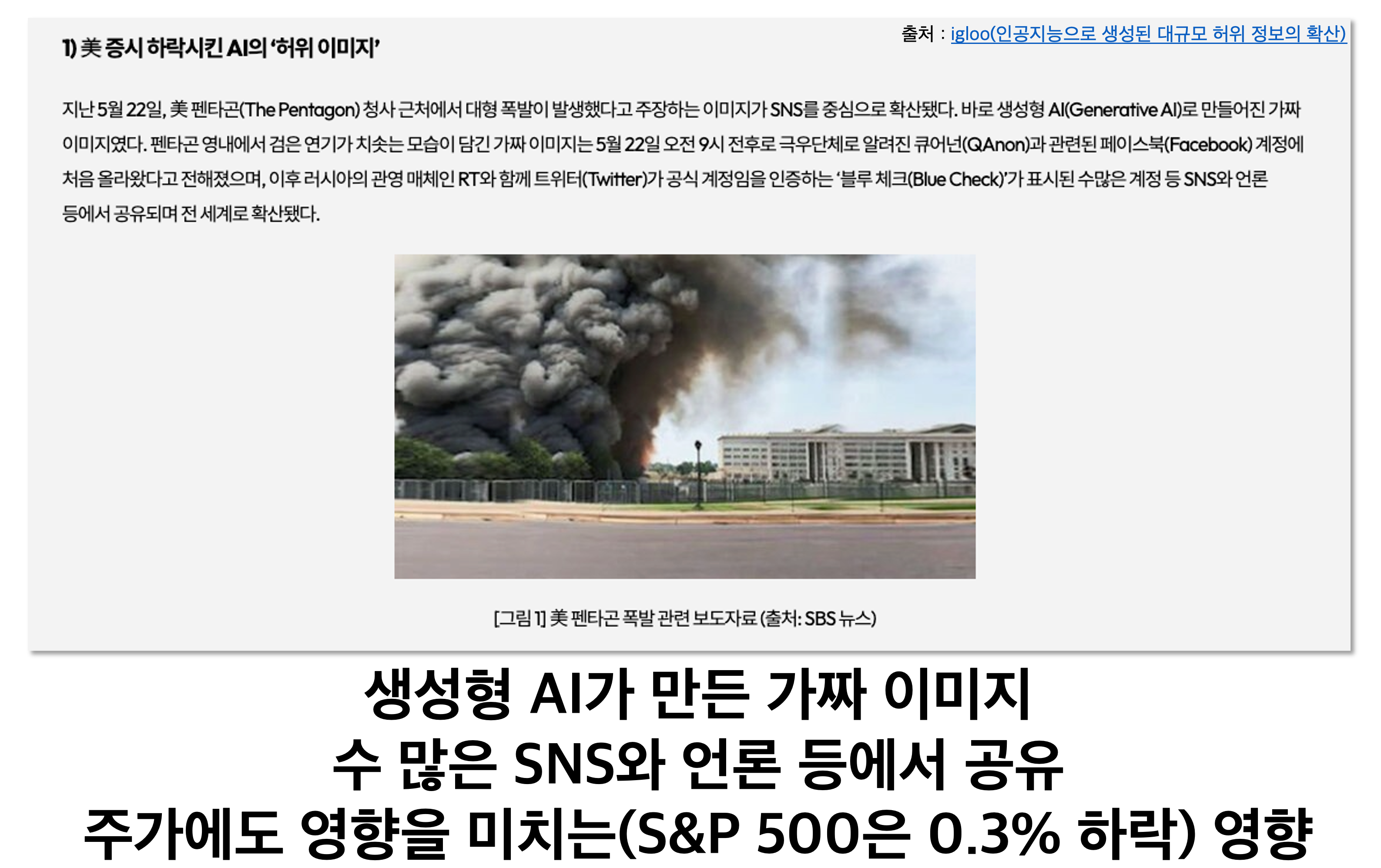 가령 왼쪽 사진은 생성형 AI가 만든 가짜 이미지인데요. AI가 만든 펜타곤 근처 폭발 사고 이미지 때문에 미국 증시도 하락한 사건이 있었습니다. 또한, 오른쪽은 요즘 우리나라 뿐만 아니라 각 나라에서 집중하고 있는 선거 때문에 만들어진 영상입니다. 이도 AI가 만들었으며, 이를 통해 허위 정보를 전달할 수 있는 가능성이 보여지는 것이죠.