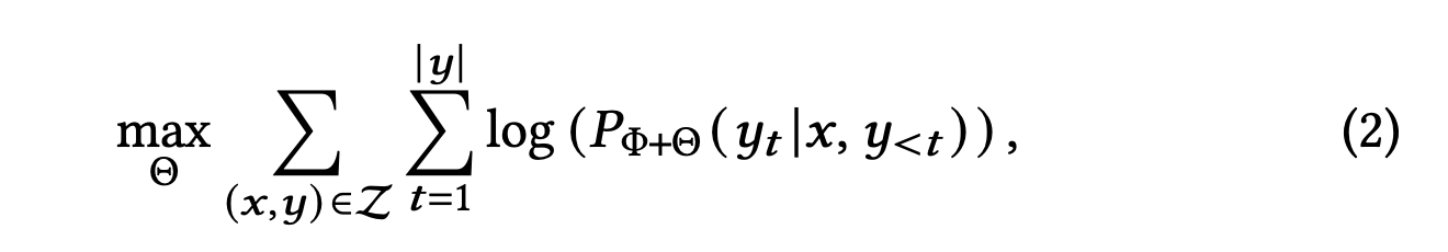 알파카 튜닝(Alpaca Tuning)은 LLM의 일반적인 문제 해결 능력을 강화하는 과정입니다. 즉, 일반화 능력을 향상시키는 과정이라고 보시면 됩니다. 이 과정은 위에서 소개한 것과 같이 self-instruction 데이터를 기반해 수행됩니다. 수식으로 표현하면 수식(1)과 같습니다.