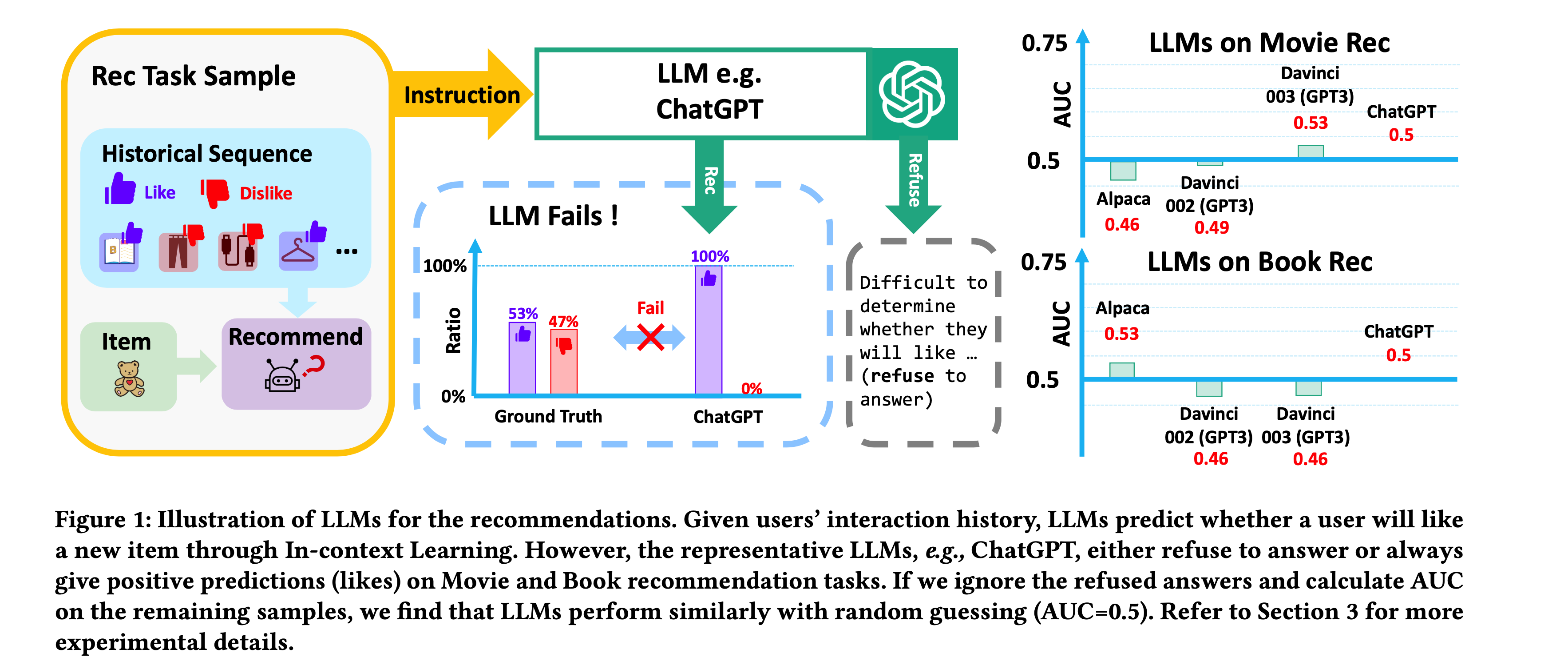 기존의 연구들은 LLM의 추천 시스템에 적용하기 위해 In-context learning 방식을 사용했습니다. 이 방법은 기존 전통적인 추천 모델(CF, MF, LightGCN 등)에서 필터링된 후보 아이템을 LLM이 재정렬 하는 정도의 역할로 사용했었죠. 하지만, 이런 접근 방법은 전통적인 추천 방법과 성능면에서 큰 차이가 없거나, 경우에 따라서는 추천을 거절하거나 항상 긍정적인 답변만 제공하는 형태도 보였습니다(Figure 1).
