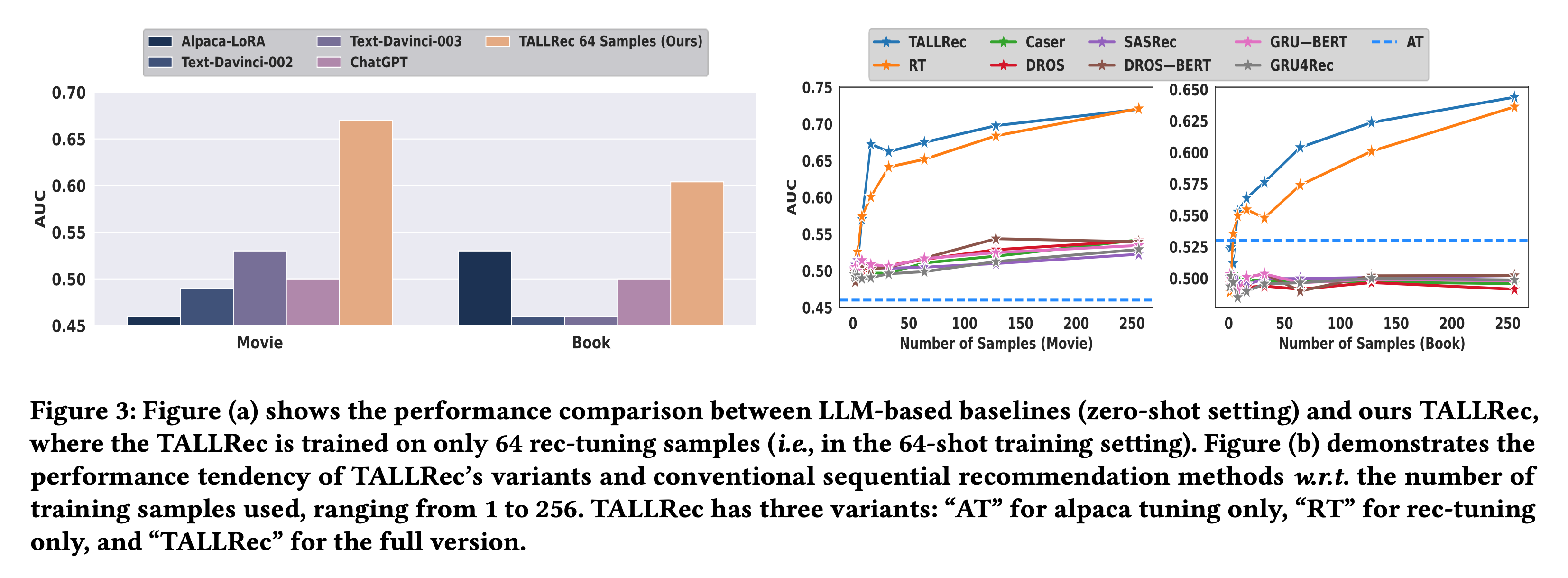 Figure 3의 왼쪽 그림인 (a)영역에서는 TALLRec과 LLM 기반 모델들의 성능을 비교한 결과를 보여줍니다.