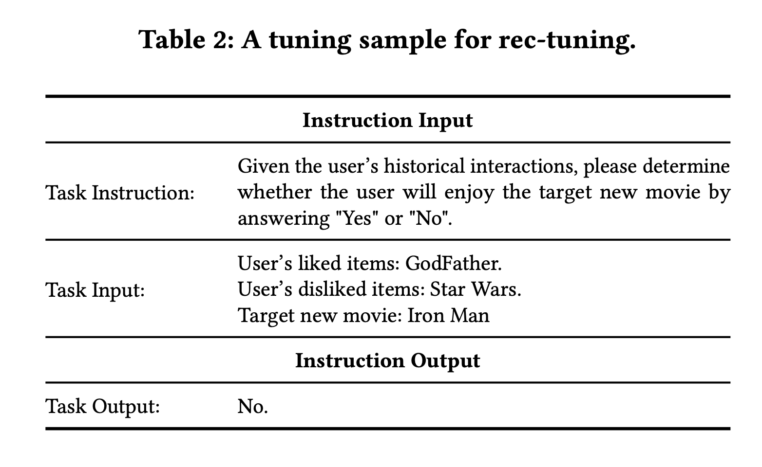 저자들은 Instruction Tuning된 LLM에 Rec-tuning 작업을 진행합니다. Rec-Tuning은 추천 시스템 작업에 특화된 LLM을 학습시키는 과정을 의미합니다. 이 과정은 아래 Table 2와 같은 과정으로 진행이 되는데요.