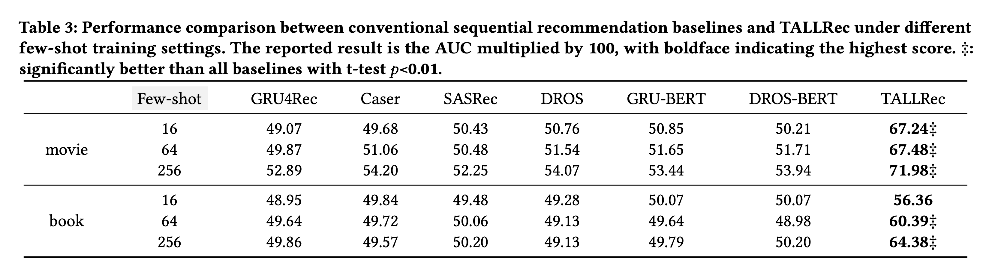 먼저 저자들은 TALLRec Framework의 성능을 평가하기 위해 기존의 전통적인 추천 시스템 방법과 LLM 기반 추천 시스템 방법과 성능을 비교하였습니다. 이때, 제한된 데이터(few-shot) 환경에서도 TALLRec이 얼마나 우수한 성능을 보여주는지 확인합니다. Table 3는 다양한 Few-shot 설정(16 또는 64 또는 256)에서 기존 전통 추천 방법들과 비교한 결과를 보여줍니다.