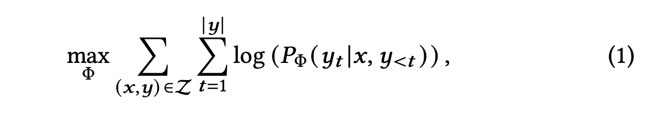 수식 (1)을 보면 \(y_t\)는 \(t\)번째 토큰이라고 보시면 됩니다. \(y_{<t}\)는 \(y_t\)전까지의 토큰을 의미합니다. 즉, 주어진 입력 \(x\)와 이전 토큰들을 기반으로 \(y_t\)가 나올 확률을 학습하는 것이죠.