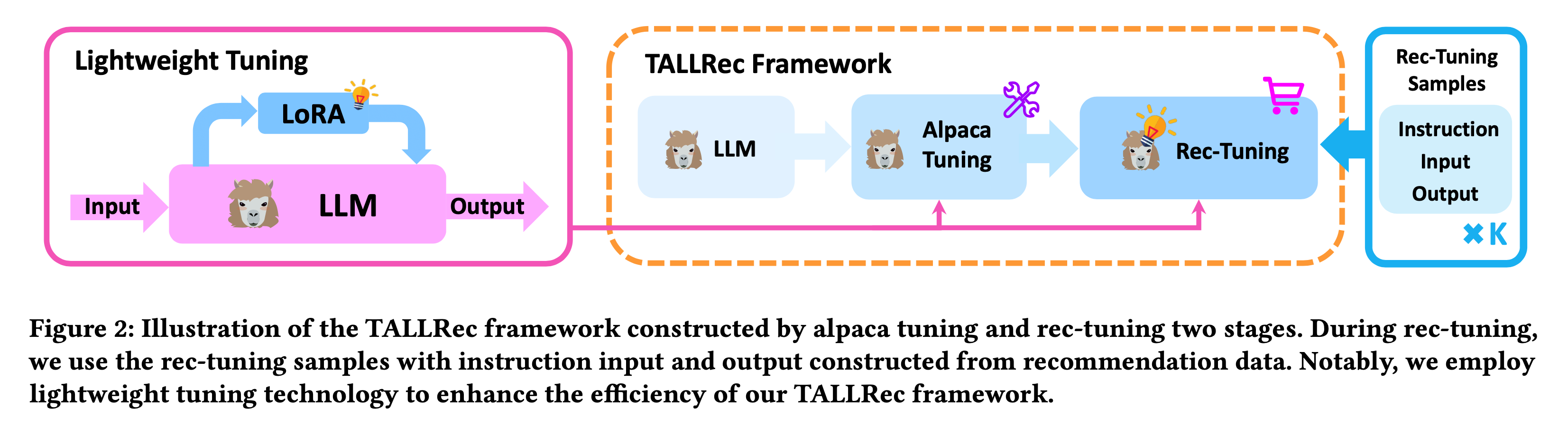 TALLRec 저자들이 주장하는 것은 대규모 언어 모델(LLM)을 추천 시스템 영역에 활용하는 것입니다. 즉, LLM을 추천 시스템에 최적화하기 위해 설계된 프레임워크이므로, 저자들은 두 가지 주요 튜닝 단계를 소개합니다. 바로 알파카 튜닝(Alpaca-Tuning)과 추천 튜닝(Rec-Tuning)입니다. 이 프로세스에 대한 설명은 Figure 2에 잘 나와있습니다.