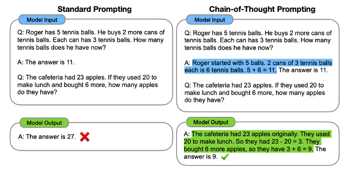 아래는 원본 Chain of Thought 논문에서 소개된 일반적인 프롬프트(Standard Prompting)과 Chain-of-Thought Prompting 방법의 비교 자료입니다.