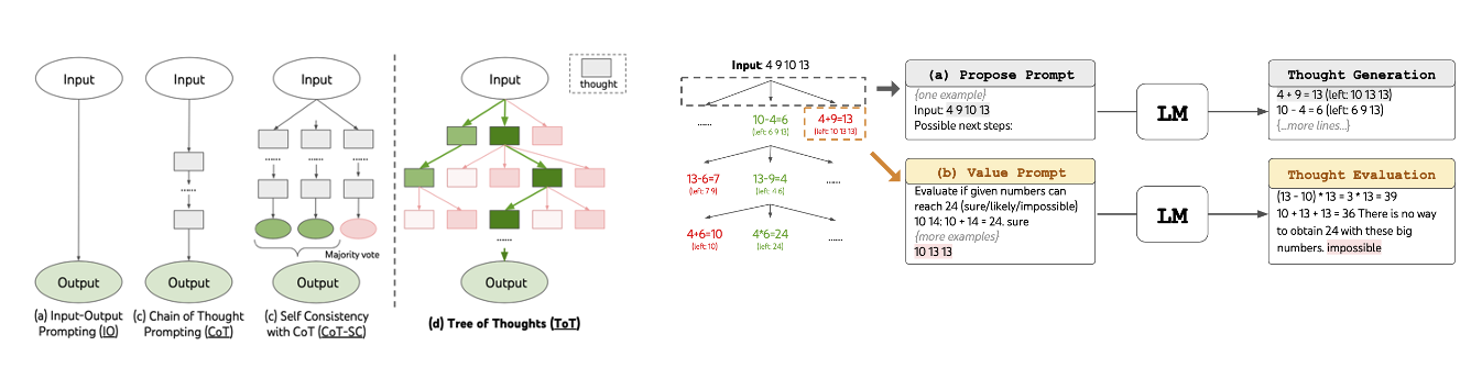 아래 사진은 Tree of Thought의 원본 논문에서 설명하는 ToT 자료인데요. CoT와 ToT의 차이점에 대해서도 확인할 수 있습니다.
