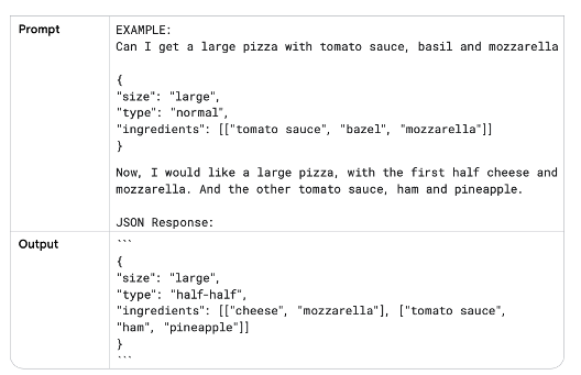고객의 주문을 JSON 형태로 파싱하라는 메세지인데요. EXAMPLE처럼 예시를 제공하여 LLM이 예시를 보고 사용자가 원하는 task를 수행하도록 합니다. 본 책에서는 few-shot의 경우 보통 3~5개 정도 사용하는 것이 좋다고 이야기하고 있습니다.