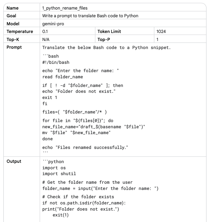 위 예시에서는 Bash 코드를 Python 코드로 변환해달라는 프롬프트를 수행했습니다. 그리고 LLM은 그 역할을 충실하게 수행합니다.