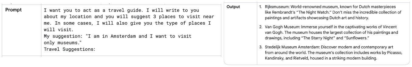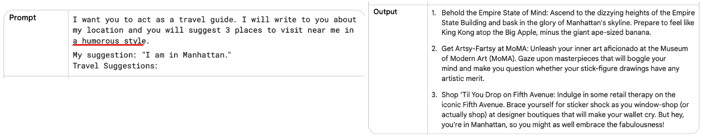 또 다른 예시는, 스타일을 변경하도록 지시하는 것입니다. 마찬가지로 여행 가이드이지만, 출력의 스타일이나 톤 등을 다르게 하는 것이죠.