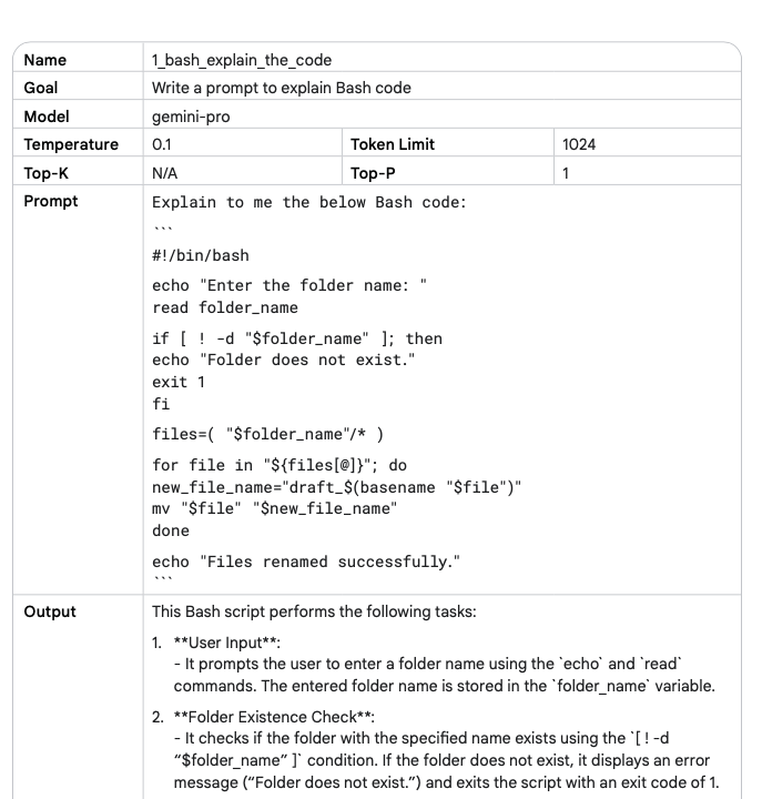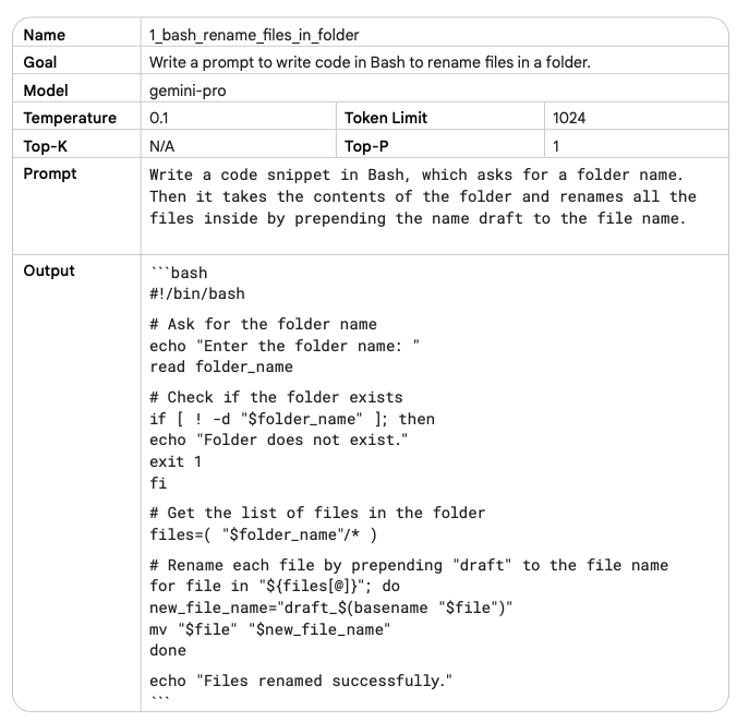 폴더의 모든 내용을 가져와서 모든 파일의 이름 앞에 draft라는 이름을 붙여 파일 이름을 저장하는 Bash 코드 스니펫을 작성해달라는 간단한 프롬프트 하나면 파일의 이름을 변경할 수 있는 간단한 코드를 빠른 시간에 받을 수 있습니다.
