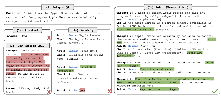 Reason & Act의 약자인 ReAct는 LLM이 자연어적인 추론과 외부 도구(검색, code interpreter)를 결합하여 복잡한 작업을 해결할 수 있게 하는 패러다임이라고 본 백서에서는 소개하고 있습니다. 이는 LLM이 특정 작업을 수행하거나 정보를 검색하기 위해 외부 API와 상호 작용하는 등의 행동을 취할 수 있게 하는 에이전트 모델링을 위한 단계라고도 볼 수 있죠. 요즘 AI Agent, Agentic AI 등 에이전트와 관련된 이야기가 많이 나오고 있는데요. 이때 ReAct prompt 방법이 많이 사용되고 있습니다.
