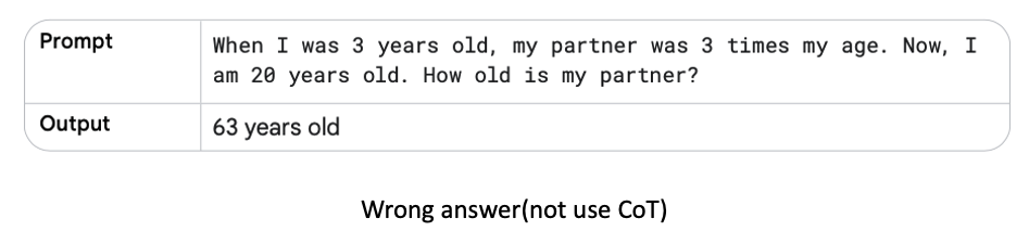 본 prompt engineering whitepaper에서는 아래와 같이 CoT의 예시를 제공합니다. 마찬가리조 CoT를 사용하지 않았을 때 올바르지 않은 정답이 나오는 것을 보여주는데요.