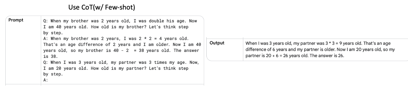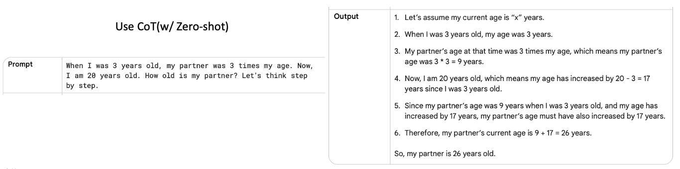 결과를 보면 일반적인 프롬프트는 수식 계산이 틀렸지만, CoT를 활용한 프롬프트에서는 reasoning 단계를 포함시키기에 LLM이 올바른 대답을 제공할 수 있음을 확인할 수 있습니다.