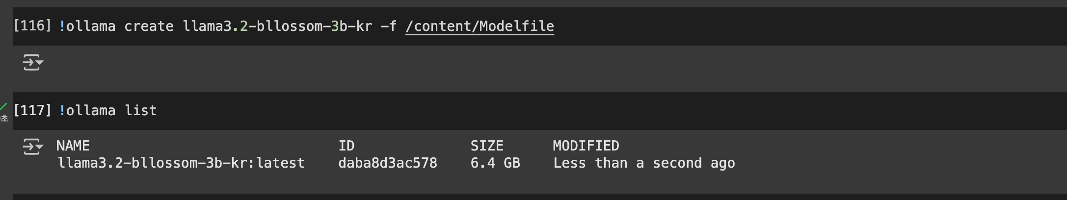 이제 !ollama list를 통해 확인하면 Modelfile로 등록한 LLM 모델이 정상적으로 셋팅된 것을 확인할 수 있습니다.