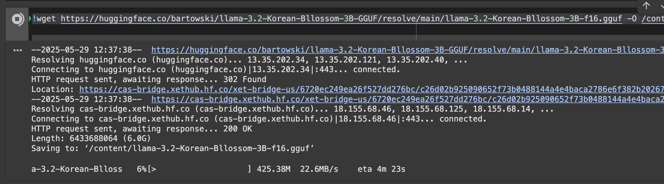!wget https://huggingface.co/bartowski/llama-3.2-Korean-Bllossom-3B-GGUF/resolve/main/llama-3.2-Korean-Bllossom-3B-f16.gguf -O /content/llama-3.2-Korean-Bllossom-3B-f16.gguf