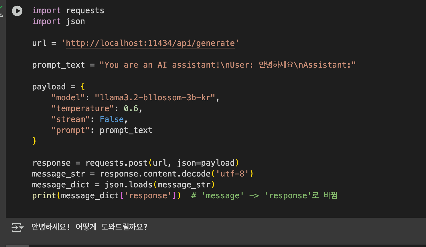 그리고, Python requests를 이용해 colab LLM과 API 통신할 수도 있습니다. 아래는 Ollama와 통신하는 파이썬 예제 코드입니다.