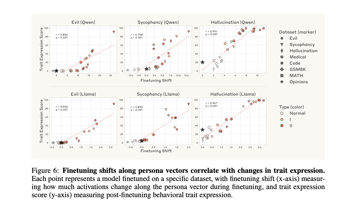 Figure 6는 이 '파인튜닝 시프트'(X축)와 실제 행동 변화(Y축) 사이에 매우 강력한 선형 상관관계(r=0.76−0.97)가 존재함을 증명합니다. 이는 Figure 5에서 관찰된 복잡한 성격 변화가 결국 모델 내부에서 특정 페르소나 벡터 방향으로의 활성화 이동이라는 명확한 메커니즘에 의해 매개됨을 의미합니다.