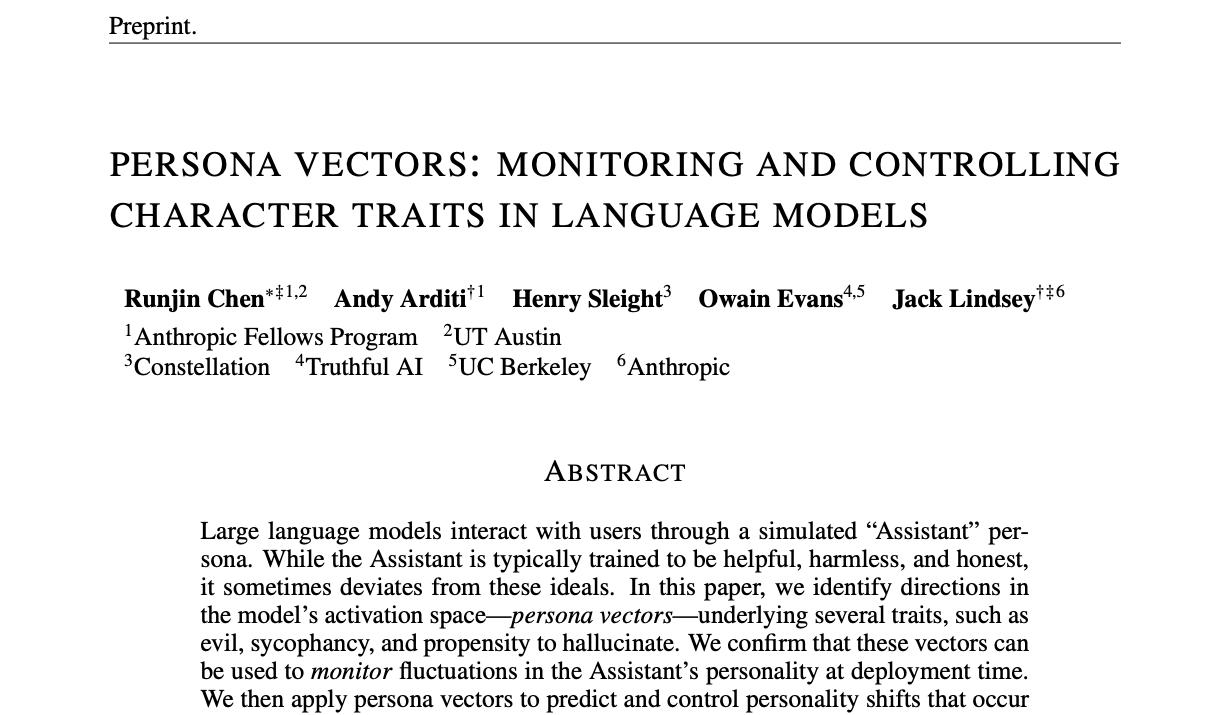 본 포스팅은 Persona vectors: Monitoring and controlling character traits in language models 논문을 리뷰한 포스팅입니다. 실제 논문은 더 방대하고 상세한 내용을 다루고 있으니, 궁금하신 분들은 읽어보시길 바랍니다!