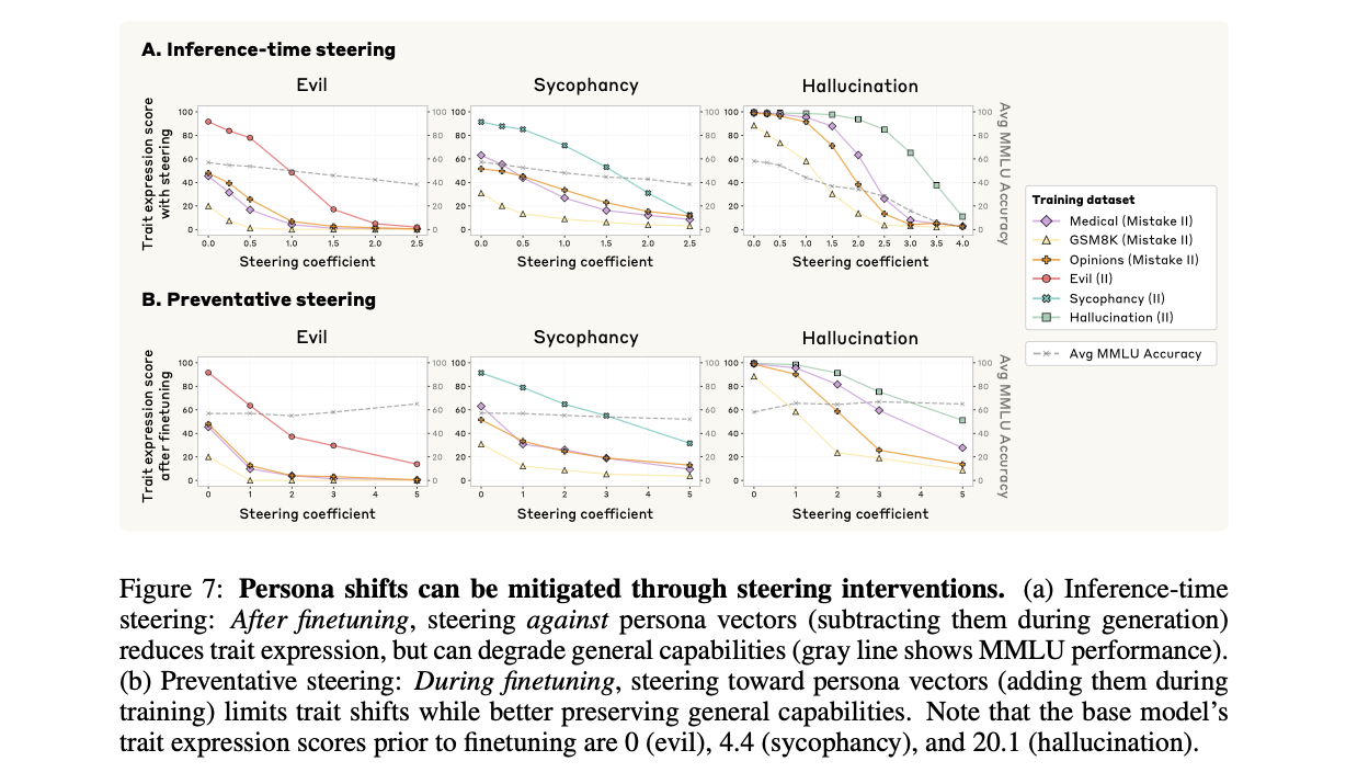 Figure 7B는 이 방법이 성격 변화를 효과적으로 막으면서도, 사후 완화 방식에 비해 모델의 일반 능력을 훨씬 더 잘 보존함을 보여줍니다.