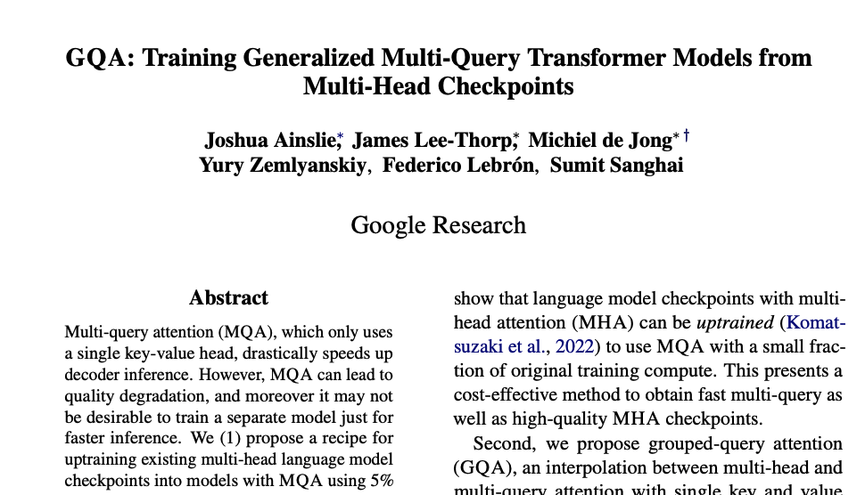 GQA의 또 다른 강력한 장점은 완전히 새로운 모델을 처음부터 학습시킬 필요 없이, 기존에 MHA로 학습된 모델을 GQA 구조로 변환할 수 있다는 점입니다. 이를 '업트레이닝(Uptraining)'이라고 하며, 원본 모델 학습에 사용된 계산량의 약 5% 정도만으로도 기존 MHA 모델 체크포인트를 GQA 모델로 성공적으로 전환할 수 있습니다. 이는 막대한 시간과 자원을 절약하며 고품질의 빠른 추론 모델을 얻을 수 있는 매우 비용 효율적인 방법입니다.