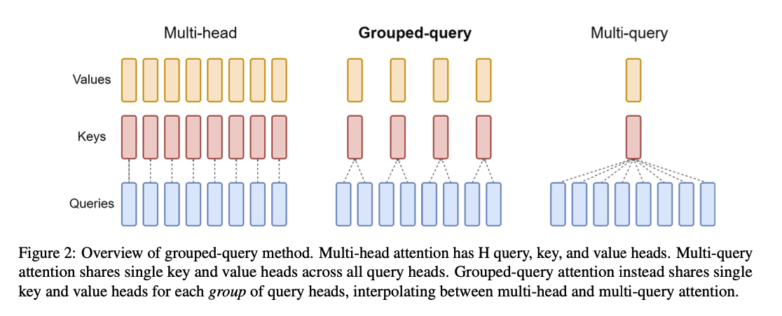 - 메모리 효율성 및 속도 향상: Key-Value 헤드의 수를 줄임으로써 메모리 사용량과 계산 복잡도를 모두 감소시킵니다. 이는 MQA와 유사하게 빠른 추론 속도로 이어집니다.