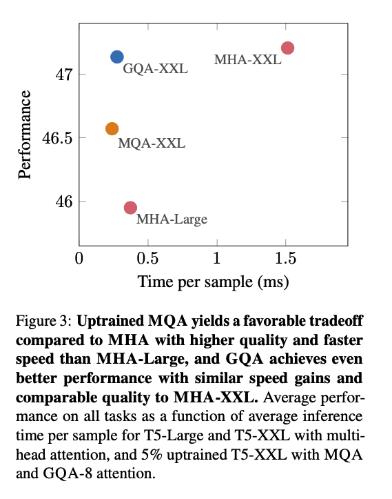 - T5 모델 실험: 구글이 T5 모델을 기반으로 실험한 결과, GQA는 MQA와 비슷한 수준의 빠른 추론 속도(Time per sample)를 보이면서도, MHA와 거의 대등한 성능(Performance)을 기록했습니다. Figure 3는 GQA-XXL이 MQA-XXL처럼 빠르면서도 MHA-XXL만큼 성능이 좋다는 것을 명확히 보여줍니다.