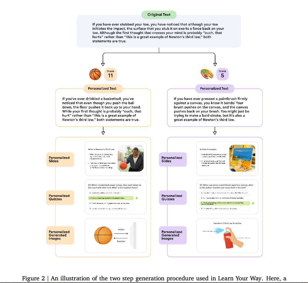 Figure 2 그림은 'Learn Your Way' 시스템의 핵심 작동 방식인 2단계 생성 절차를 명확하게 보여줍니다. 상단에는 OpenStax 교재에 실린 뉴턴의 제3법칙에 대한 일반적인 예시("발가락을 부딪혔을 때의 경험")가 제시됩니다.