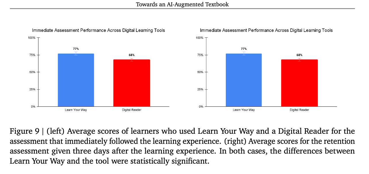 Figure 9은 'Learn Your Way'의 학습 효과를 검증하기 위해 진행된 무작위 통제 실험의 결과를 보여줍니다. 이 실험은 'Learn Your Way'를 사용한 그룹과 일반 '디지털 리더(Adobe Acrobat Reader)'를 사용한 통제 그룹의 성적을 비교했습니다.